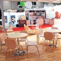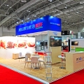 Stevens developed a solution utilizing mostly rental elements to construct a booth that fit within the harmony of the clients existing brand, thereby extending their brand to within the Canadian marketplace. Large visuals applied to a rental laminate wall allowed for excellent brand recognition along with dimension 3D cut letters mounted to the surface of a large overhead structure that allowed for distance visibility. A kitchen was incorporated into the storage area of the exhibit allowing the client to prepare light food and coffee for visitors. A large video monitor behind the front reception provided for continuous looping video of presentations.