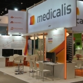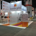 Design a Rental Exhibit with a strong Medicalis branding to attract attention across the exhibit hall. An open and spacious layout was needed to accommodate high volume of attendees and multiple presentation areas within the booth space. A secure server room was also required for housing computers and equipment, as well as additional storage space. Flexibility was a key element as the exhibit is to be used at multiple shows requiring different brand messages.