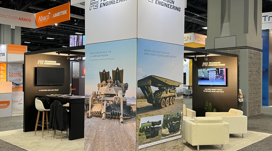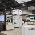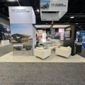 The exhibit designed by stevensE3 created an open, welcoming space that effectively conveyed the client's brand message. The layout featured a prominent reception area at the front, with a modern desk that included hidden storage for functionality. Two lounge areas on either side of the booth provided comfortable seating and charging stations to enhance visitor engagement. High-visibility wayfinding was achieved through a large 10ft x 10ft hanging sign, ensuring the exhibit could be easily located from a distance and reinforcing the client’s branding.