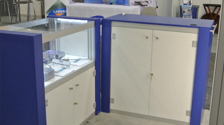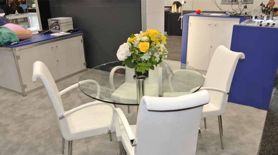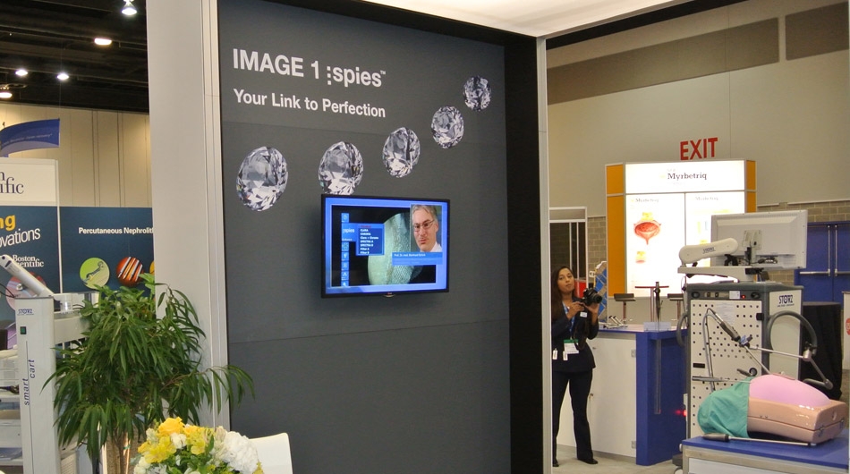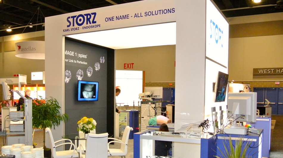 An attractive hybrid exhibit was designed and built using elements well suited for both in-line and island tradeshow spaces. Creative features such as touch screen monitors, a stretched fabric ceiling and LED lighting contributed to a clean design, which was ideal for the medical device industry. The design was so well received at an international show in 2013 that other Karl Storz locations outside of Canada requested the use of this new exhibit at their national conferences.