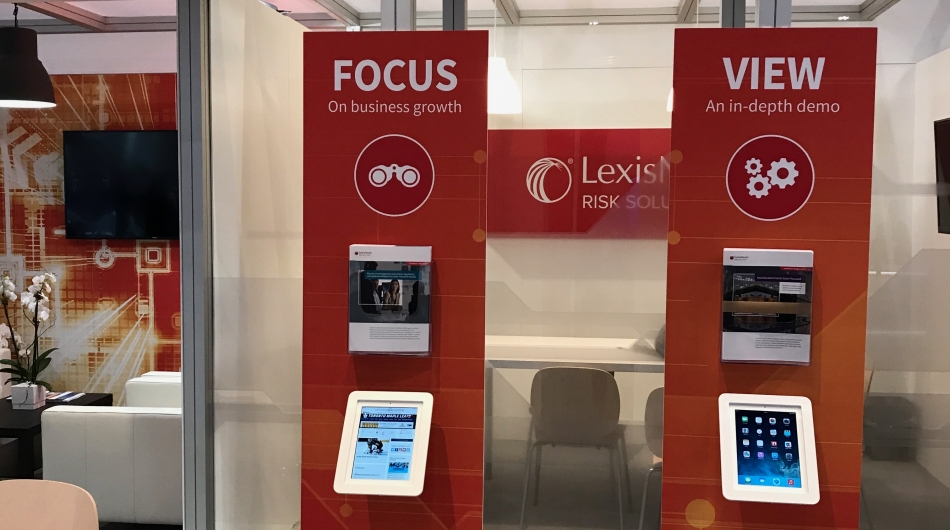 Design and prepare an exhibit that would be used in a high profile global banking show that would take place in Toronto, Canada. Create a professional image utilizing corporate branding, and allowing for both private and public meeting spaces to be utilized. Client wished to be able to demonstrate web-based products on iPads located within the booth as well as show corporate videos and product demonstrations.