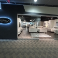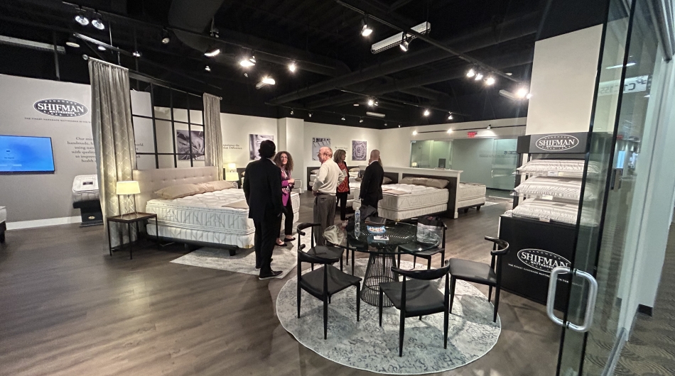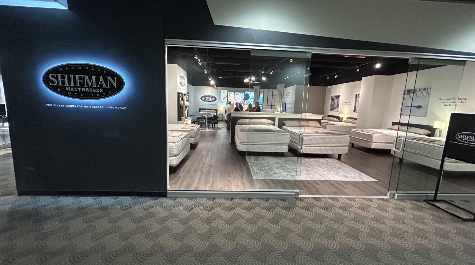By using the online tour of Shifman’s Hightpoint showroom, stevens E3 designers were able to quickly survey the existing look and feel.  The floorplan went through several iterations to make the most of the real estate but retain enough open space.  In the end a combination of powder coated aluminum extrusion and CNC cut Sintra panels created bright and unusual backdrops for their top of the line beds.  False walls were created using bookshelves and painted backer boards to block visibility into the staff area and kitchen in the back of the room. Some of the all-natural materials in Shifman beds were integrated into an elegant sample display as well as a small privacy wall. Listen to what Tim Wade has to say about his experience working with stevensE3.