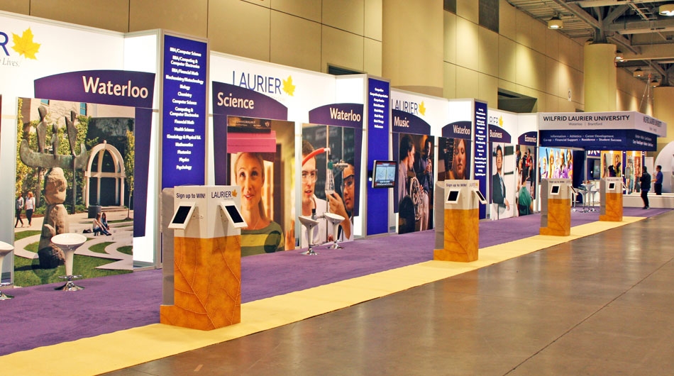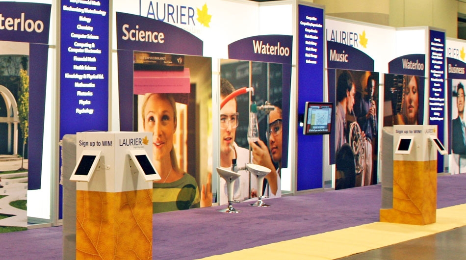 Stevens E3 developed a design with state-of-the art touch screens and ipads generously dispersed throughout the booth space to maximize interaction and data collection. The central section provided instant identification from all areas of the exhibit hall, using a 3-tiered Tension Fabric header with high impact branding. The Wilfrid Laurier name was a focal point of the exhibit. This area of the booth provided a large open space to offer general information and direction of the traffic to appropriate people to talk to. The faculty areas opened up to the left and right of the - clearly identifying the multi-campus environment and program identification. A "fun area" adjacent to the main area created excitement and activity reflecting the community atmosphere at Laurier - bringing the "feel" of the campus to the show floor. Conversation was encouraged throughout the booth space - supported by the availability of view books close at hand - from 6 large free standing kiosks - at any one time 5,000 view books were just steps away.